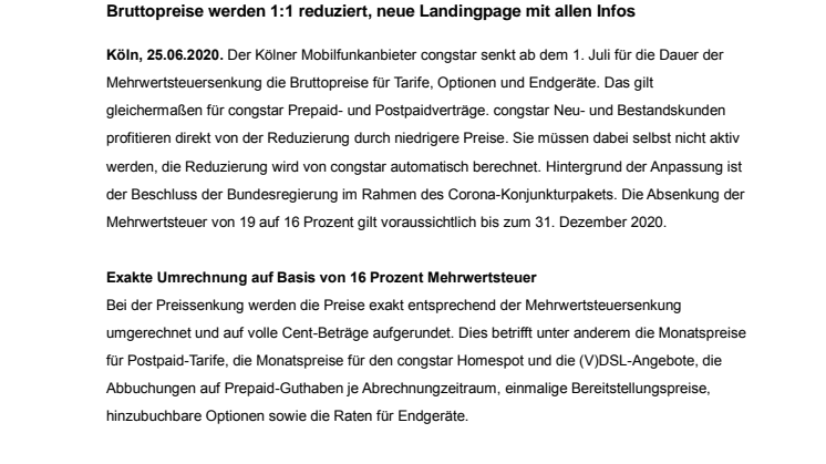 Um Kunden über alle Vorteile der Mehrwertsteuersenkung und Fragen in diesem Zusammenhang zu informieren, hat congstar auch eine Landingpage eingerichtet. Unter www.congstar.de/mehrwertsteuer werden die wichtigsten Fragen zur Anpassung beantwortet.