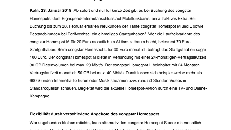 Köln, 23. Januar 2018. Ab sofort und nur für kurze Zeit gibt es bei Buchung des congstar Homespots, dem Highspeed-Internetanschluss auf Mobilfunkbasis, ein attraktives Extra. Bei Buchung bis zum 28. Februar erhalten Neukunden der Tarife congstar Homespot M und L sowie Bestandskunden bei Tarifwechsel ein einmaliges Startguthaben. Wer die Laufzeitvariante des congstar Homespot M für 20 Euro monatlich im Aktionszeitraum bucht, bekommt 70 Euro Startguthaben. Beim congstar Homespot L für 30 Euro monatlich beträgt das Startguthaben sogar 100 Euro. Der congstar Homespot M bietet in Verbindung mit einer 24-monatigen-Vertragslaufzeit 30 GB Datenvolumen bei max. 20 Mbit/s. Der congstar Homespot L beinhaltet mit 24 Monaten Vertragslaufzeit monatlich 50 GB bei max. 40 Mbit/s. Damit lassen sich beispielsweise mehr als 600 Stunden Internetradio hören oder Musik streamen bzw. rund 50 Stunden Videos in Standardqualität schauen. Begleitet wird die aktuelle Homespot-Aktion durch eine TV- und Online-Kampagne.