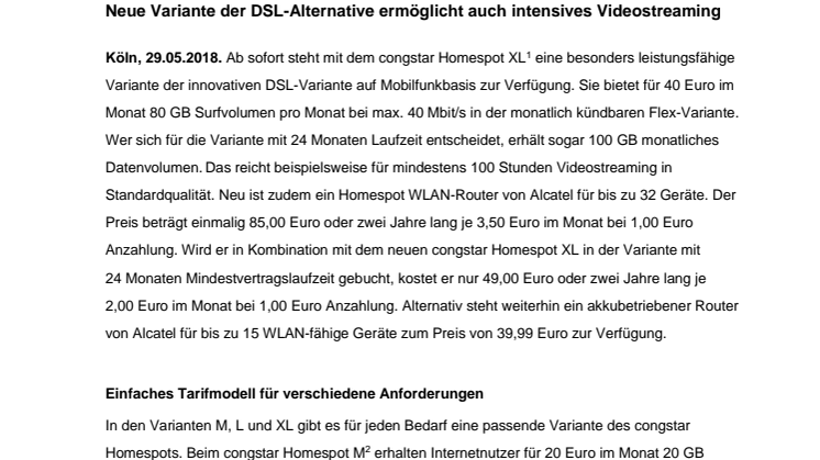 Köln, 29. Mai 2018. Ab sofort steht mit dem congstar Homespot XL eine besonders leistungsfähige Variante der innovativen DSL-Variante auf Mobilfunkbasis zur Verfügung. Sie bietet für 40 Euro im Monat 80 GB Surfvolumen pro Monat bei max. 40 Mbit/s in der monatlich kündbaren Flex-Variante. Wer sich für die Variante mit 24 Monaten Laufzeit entscheidet, erhält sogar 100 GB monatliches Datenvolumen. Das reicht beispielsweise für mindestens 100 Stunden Videostreaming in Standardqualität. Neu ist zudem ein Homespot WLAN-Router von Alcatel für bis zu 32 Geräte. Der Preis beträgt einmalig 85,00 Euro oder zwei Jahre lang je 3,50 Euro im Monat bei 1,00 Euro Anzahlung. Wird er in Kombination mit dem neuen congstar Homespot XL in der Variante mit 24 Monaten Mindestvertragslaufzeit gebucht, kostet er nur 49,00 Euro oder zwei Jahre lang je 2,00 Euro im Monat bei 1,00 Euro Anzahlung. Alternativ steht weiterhin ein akkubetriebener Router von Alcatel für bis zu 15 WLAN-fähige Geräte zum Preis von 39,99 Euro zur Verfügung.