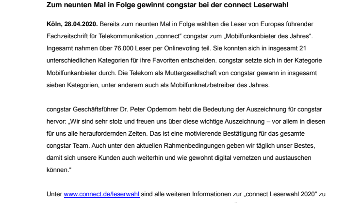 Köln, 28.04.2020. Bereits zum neunten Mal in Folge wählten die Leser von Europas führender Fachzeitschrift für Telekommunikation „connect“ congstar zum „Mobilfunkanbieter des Jahres“. Ingesamt nahmen über 76.000 Leser per Onlinevoting teil. Sie konnten sich in insgesamt 21 unterschiedlichen Kategorien für ihre Favoriten entscheiden. congstar setzte sich in der Kategorie Mobilfunkanbieter durch. Die Telekom als Muttergesellschaft von congstar gewann in insgesamt sieben Kategorien, unter anderem auch als Mobilfunknetzbetreiber des Jahres.