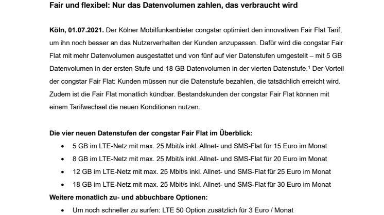 Köln, 01.07.2021. Der Kölner Mobilfunkanbieter congstar optimiert den innovativen Fair Flat Tarif, um ihn noch besser an das Nutzerverhalten der Kunden anzupassen. Dafür wird die congstar Fair Flat mit mehr Datenvolumen ausgestattet und von fünf auf vier Datenstufen umgestellt – mit 5 GB Datenvolumen in der ersten Stufe und 18 GB Datenvolumen in der vierten Datenstufe. Der Vorteil der congstar Fair Flat: Kunden müssen nur die Datenstufe bezahlen, die tatsächlich erreicht wird. Zudem ist die Fair Flat monatlich kündbar. Bestandskunden der congstar Fair Flat können mit einem Tarifwechsel die neuen Konditionen nutzen.