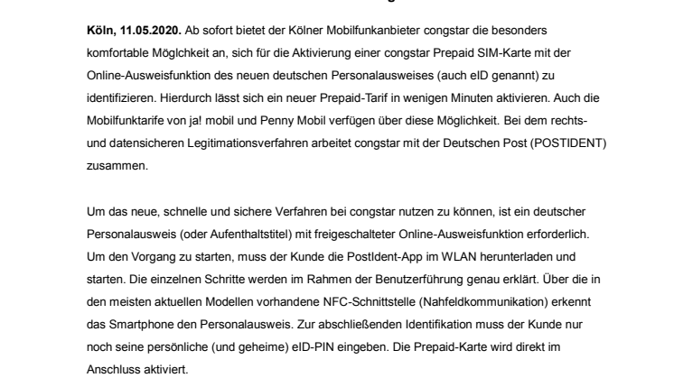 Köln, 11.05.2020. Ab sofort bietet der Kölner Mobilfunkanbieter congstar die besonders komfortable Möglchkeit an, sich für die Aktivierung einer congstar Prepaid SIM-Karte mit der Online-Ausweisfunktion des neuen deutschen Personalausweises (auch eID genannt) zu identifizieren. Hierdurch lässt sich ein neuer Prepaid-Tarif in wenigen Minuten aktivieren. Auch die Mobilfunktarife von ja! mobil und Penny Mobil verfügen über diese Möglichkeit. Bei dem rechts- und datensicheren Legitimationsverfahren arbeitet congstar mit der Deutschen Post (POSTIDENT) zusammen.