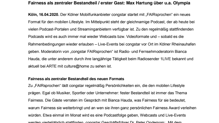 Zu „FAIRsprochen“ lädt congstar regelmäßig Persönlichkeiten ein, die den mobilen Lifestyle prägen. Egal ob Musiker, Sportler oder Unternehmer: fester Bestandteil ist immer das Thema Fairness. Die Gäste verraten im Gespräch mit Bianca Hauda, was Fairness für sie bedeutet, warum Fairness sie weiterbringt und an wen sie ihren ganz persönlichen Fairness Award verleihen würden. Etwa einmal im Monat wird es eine Podcastfolge geben, Webcasts und Live-Events werden vierteljährlich stattfinden. congstar Geschäftsführer Dr. Peter Opdemom: „Mit dem multimedialen Eventformat ‚FAIRsprochen‘ wollen wir interessanten Persönlichkeiten, die eine klare Meinung haben und Haltung zeigen, eine Plattform zum Dialog bieten. Dabei versuchen wir immer, Themen aufzugreifen, die sowohl zu unserem Gast als auch zu congstar als Mobilfunkanbieter passen.“