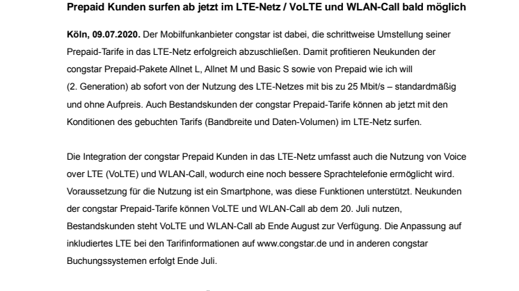 Die Integration der congstar Prepaid Kunden in das LTE-Netz umfasst auch die Nutzung von Voice over LTE (VoLTE) und WLAN-Call, wodurch eine noch bessere Sprachtelefonie ermöglicht wird. Voraussetzung für die Nutzung ist ein Smartphone, das diese Funktionen unterstützt. Neukunden der congstar Prepaid-Tarife können VoLTE und WLAN-Call ab dem 20. Juli nutzen, Bestandskunden steht VoLTE und WLAN-Call ab Ende August zur Verfügung. Die Anpassung auf inkludiertes LTE bei den Tarifinformationen auf www.congstar.de und in anderen congstar Buchungssystemen erfolgt Ende Juli.