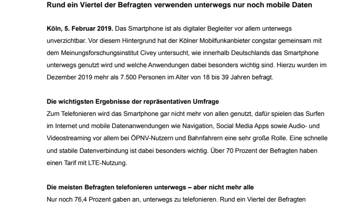Köln, 5. Februar 2019. Das Smartphone ist als digitaler Begleiter vor allem unterwegs unverzichtbar. Vor diesem Hintergrund hat der Kölner Mobilfunkanbieter congstar gemeinsam mit dem Meinungsforschungsinstitut Civey untersucht, wie innerhalb Deutschlands das Smartphone unterwegs genutzt wird und welche Anwendungen dabei besonders wichtig sind. Hierzu wurden im Dezember 2019 mehr als 7.500 Personen im Alter von 18 bis 39 Jahren befragt.