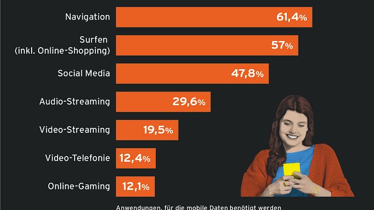 Die Ergebnisse der Studie zeigen auch, dass Männer ihr Smartphone unterwegs insgesamt häufiger verwenden und auch monatlich mehr Daten zur Verfügung haben. So nutzen fast 85 Prozent der Männer unterwegs Anwendungen, für die sie mobile Daten oder das Internet benötigen. Bei den Frauen sind es knapp 70 Prozent. Zudem verfügen rund 40 Prozent der Männer über mehr als 5 GB Datenvolumen pro Monat. Bei den Frauen sind es 30 Prozent. Vor allem bei datenintensiven Anwendungen wie Videostreaming (25,7 zu 13 Prozent) und Audiostreaming (38,3 zu 20,6 Prozent) sowie bei Navigation (66,4 zu 56,3 Prozent) und klassischem Surfen (inkl. Online-Shopping) liegen Männer mit 64,7 zu 49 Prozent vorne.