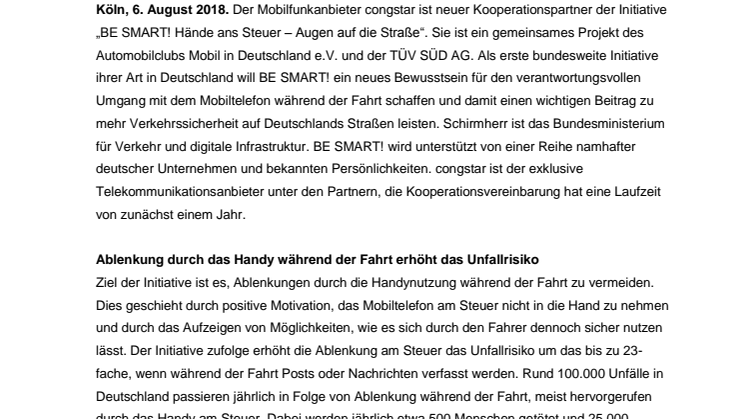 Köln, 6. August 2018. Der Mobilfunkanbieter congstar ist neuer Kooperationspartner der Initiative „BE SMART! Hände ans Steuer – Augen auf die Straße“. Sie ist ein gemeinsames Projekt des Automobilclubs Mobil in Deutschland e.V. und der TÜV SÜD AG. Als erste bundesweite Initiative ihrer Art in Deutschland will BE SMART! ein neues Bewusstsein für den verantwortungsvollen Umgang mit dem Mobiltelefon während der Fahrt schaffen und damit einen wichtigen Beitrag zu mehr Verkehrssicherheit auf Deutschlands Straßen leisten. Schirmherr ist das Bundesministerium für Verkehr und digitale Infrastruktur. BE SMART! wird unterstützt von einer Reihe namhafter deutscher Unternehmen und bekannten Persönlichkeiten. congstar ist der exklusive Telekommunikationsanbieter unter den Partnern, die Kooperationsvereinbarung hat eine Laufzeit von zunächst einem Jahr.