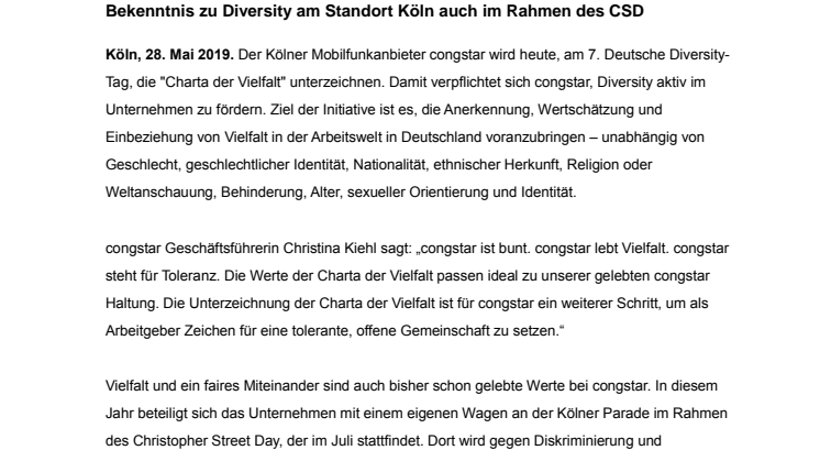 Köln, 28. Mai 2019. Der Kölner Mobilfunkanbieter congstar wird heute, am 7. Deutsche Diversity-Tag, die "Charta der Vielfalt" unterzeichnen. Damit verpflichtet sich congstar, Diversity aktiv im Unternehmen zu fördern. Ziel der Initiative ist es, die Anerkennung, Wertschätzung und Einbeziehung von Vielfalt in der Arbeitswelt in Deutschland voranzubringen – unabhängig von Geschlecht, geschlechtlicher Identität, Nationalität, ethnischer Herkunft, Religion oder Weltanschauung, Behinderung, Alter, sexueller Orientierung und Identität.