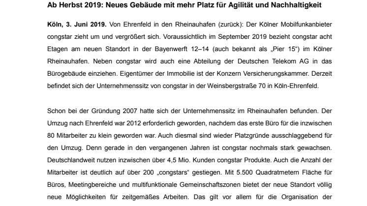 Köln, 3. Juni 2019. Von Ehrenfeld in den Rheinauhafen (zurück): Der Kölner Mobilfunkanbieter congstar zieht um und vergrößert sich. Voraussichtlich im September 2019 bezieht congstar acht Etagen am neuen Standort in der Bayenwerft 12–14 (auch bekannt als „Pier 15“) im Kölner Rheinauhafen. Neben congstar wird auch eine Abteilung der Deutschen Telekom AG in das Bürogebäude einziehen. Eigentümer der Immobilie ist der Konzern Versicherungskammer. Derzeit befindet sich der Unternehmenssitz von congstar in der Weinsbergstraße 70 in Köln-Ehrenfeld.