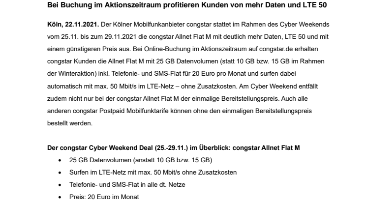 Köln, 22.11.2021. Der Kölner Mobilfunkanbieter congstar stattet im Rahmen des Cyber Weekends vom 25.11. bis zum 29.11.2021 die congstar Allnet Flat M mit deutlich mehr Daten, LTE 50 und mit einem günstigeren Preis aus.