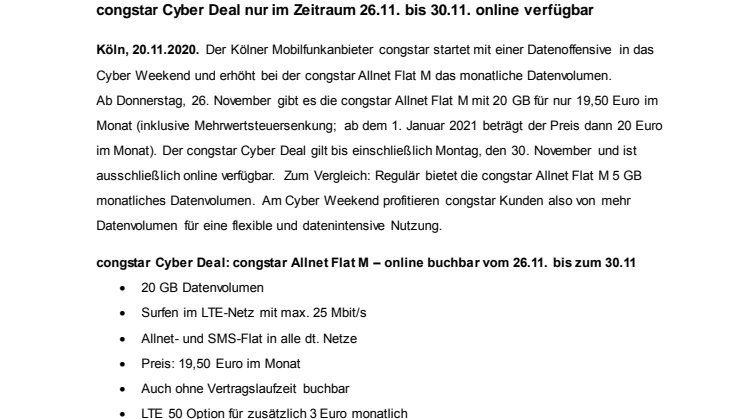 Köln, 20.11.2020. Der Kölner Mobilfunkanbieter congstar startet mit einer Datenoffensive in das Cyber Weekend und erhöht bei der congstar Allnet Flat M das monatliche Datenvolumen.