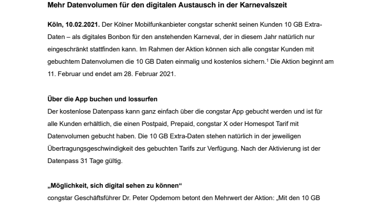 congstar Geschäftsführer Dr. Peter Opdemom betont den Mehrwert der Aktion: „Mit den 10 GB Extra-Daten möchten wir unseren Kunden die Möglichkeit geben, an den Karnevalstagen Freunde und Familie zumindest digital zu sehen oder Filme, Serien und Events streamen zu können.“