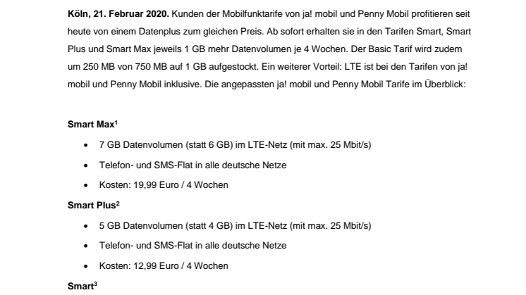 Köln, 21. Februar 2020. Kunden der Mobilfunktarife von ja! mobil und Penny Mobil profitieren seit heute von einem Datenplus zum gleichen Preis. Ab sofort erhalten sie in den Tarifen Smart, Smart Plus und Smart Max jeweils 1 GB mehr Datenvolumen je 4 Wochen. Der Basic Tarif wird zudem um 250 MB von 750 MB auf 1 GB aufgestockt. Ein weiterer Vorteil: LTE ist bei den Tarifen von ja! mobil und Penny Mobil inklusive.