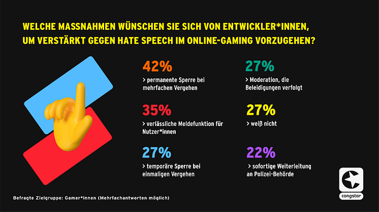 Die meisten Gamer*innen (42 Prozent) wünschen sich eine permanente Sperre bei mehrfachen Vergehen, dicht gefolgt von einer verlässlichen Meldefunktion für betroffene Nutzer*innen (35 Prozent). Immerhin 27 Prozent befürworten eine temporäre Sperre, die auch schon dann greift, wenn eine Person zum ersten Mal mit toxischem Verhalten auffällig wird.
