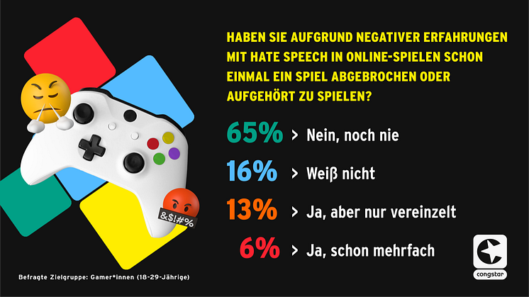 Es zeigt sich, dass toxisches Verhalten beim Online-Gaming ein relevantes Problem ist, von dem insbesondere jüngere Gamer*innen zunehmend betroffen sind. Darüber, wie man gegen verbale Gewalt im Online-Gaming vorgehen sollte, herrscht innerhalb der Community zwar noch Uneinigkeit – klar ist allerdings, dass man der Entwicklung mit Entschlossenheit wird entgegentreten müssen. „Gaming hat als Kulturgut einen hohen gesellschaftlichen Wert. Wie auch im allgemeinen gesellschaftlichen Miteinander sollte auch bei Gamer*innen untereinander stets Respekt, Wertschätzung und Toleranz an erster Stelle stehen“, sagt Timo Wakulat, Senior Manager PR & Pressesprecher bei congstar. „Mit der Studie wollen wir proaktiv darauf aufmerksam machen, dass es tatsächlich nicht immer so ist und einen Beitrag dazu leisten, dass Gamer*innen ihr eigenes und das Verhalten ihrer Mitspieler*innen reflektieren.“