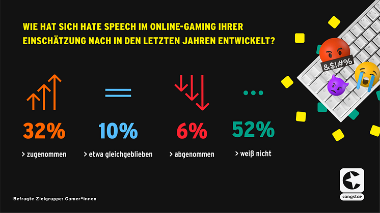 32 Prozent der Gamer*innen sind der Meinung, dass toxisches Verhalten beim Online-Gaming zugenommen hat, während sechs Prozent der Befragten angeben, zuletzt seltener toxische Ausfälle in ihrem Gaming-Umfeld erlebt zu haben. Somit sind mehr als fünfmal mehr Gamer*innen der Überzeugung, dass toxische Verhaltensweisen innerhalb der Gaming-Community zunehmen als andersherum.