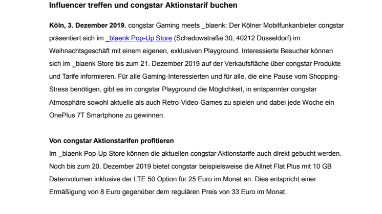 Köln, 3. Dezember 2019. congstar Gaming meets _blaenk: Der Kölner Mobilfunkanbieter congstar präsentiert sich im _blaenk Pop-Up Store (Schadowstraße 30, 40212 Düsseldorf) im Weihnachtsgeschäft mit einem eigenen, exklusiven Playground. Interessierte Besucher können sich im _blaenk Store bis zum 21. Dezember 2019 auf der Verkaufsfläche über congstar Produkte und Tarife informieren. Für alle Gaming-Interessierten und für alle, die eine Pause vom Shopping-Stress benötigen, gibt es im congstar Playground die Möglichkeit, in entspannter congstar Atmosphäre sowohl aktuelle als auch Retro-Video-Games zu spielen und dabei jede Woche ein OnePlus 7T Smartphone zu gewinnen.