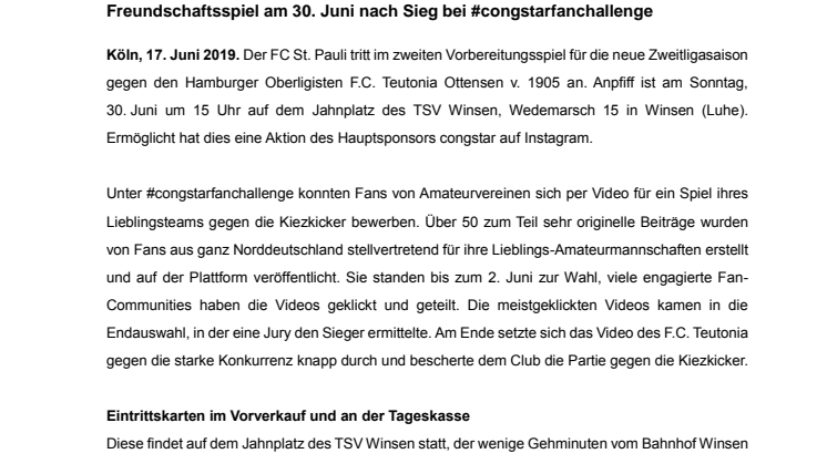 Köln, 17. Juni 2019. Der FC St. Pauli tritt im zweiten Vorbereitungsspiel für die neue Zweitligasaison gegen den Hamburger Oberligisten F.C. Teutonia Ottensen v. 1905 an. Anpfiff ist am Sonntag, 30. Juni um 15 Uhr auf dem Jahnplatz des TSV Winsen, Wedemarsch 15 in Winsen (Luhe). Ermöglicht hat dies eine Aktion des Hauptsponsors congstar auf Instagram.