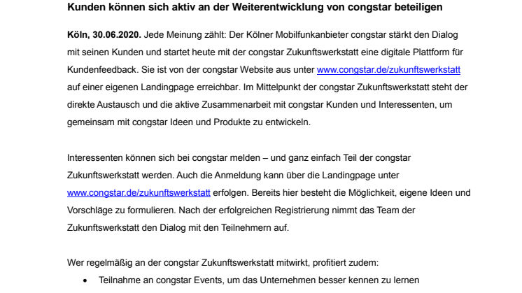 Köln, 30.06.2020. Jede Meinung zählt: Der Kölner Mobilfunkanbieter congstar stärkt den Dialog mit seinen Kunden und startet heute mit der congstar Zukunftswerkstatt eine digitale Plattform für Kundenfeedback. Sie ist von der congstar Website aus unter www.congstar.de/zukunftswerkstatt auf einer eigenen Landingpage erreichbar.