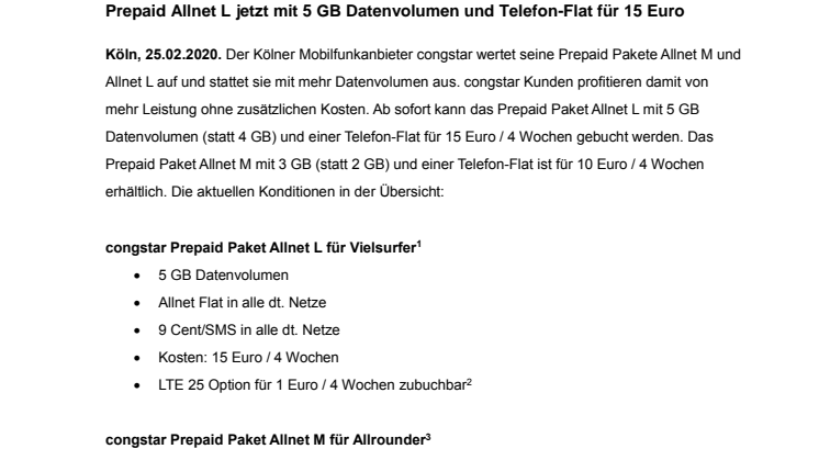 Köln, 25.02.2020. Der Kölner Mobilfunkanbieter congstar wertet seine Prepaid Pakete Allnet M und Allnet L auf und stattet sie mit mehr Datenvolumen aus. congstar Kunden profitieren damit von mehr Leistung ohne zusätzlichen Kosten. Ab sofort kann das Prepaid Paket Allnet L mit 5 GB Datenvolumen (statt 4 GB) und einer Telefon-Flat für 15 Euro / 4 Wochen gebucht werden. Das Prepaid Paket Allnet M mit 3 GB (statt 2 GB) und einer Telefon-Flat ist für 10 Euro / 4 Wochen erhältlich.