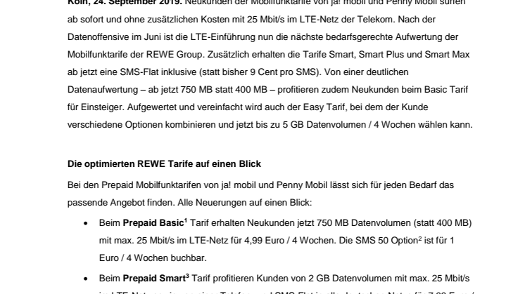 Köln, 24. September 2019. Neukunden der Mobilfunktarife von ja! mobil und Penny Mobil surfen ab sofort und ohne zusätzlichen Kosten mit 25 Mbit/s im LTE-Netz der Telekom. Nach der Datenoffensive im Juni ist die LTE-Einführung nun die nächste bedarfsgerechte Aufwertung der Mobilfunktarife der REWE Group. Zusätzlich erhalten die Tarife Smart, Smart Plus und Smart Max ab jetzt eine SMS-Flat inklusive (statt bisher 9 Cent pro SMS). Von einer deutlichen Datenaufwertung – ab jetzt 750 MB statt 400 MB – profitieren zudem Neukunden beim Basic Tarif für Einsteiger. Aufgewertet und vereinfacht wird auch der Easy Tarif, bei dem der Kunde verschiedene Optionen kombinieren und jetzt bis zu 5 GB Datenvolumen / 4 Wochen wählen kann.