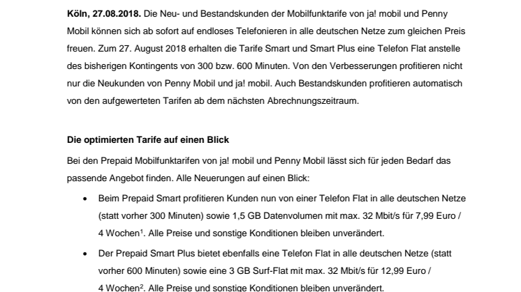 Köln, 27. August 2018. Die Neu- und Bestandskunden der Mobilfunktarife von ja! mobil und Penny