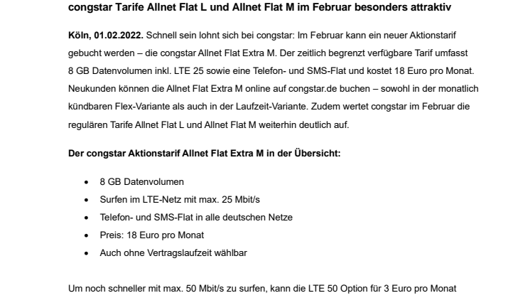 Köln, 01.02.2022. Schnell sein lohnt sich bei congstar: Im Februar kann ein neuer Aktionstarif gebucht werden – die congstar Allnet Flat Extra M. Der zeitlich begrenzt verfügbare Tarif umfasst 8 GB Datenvolumen inkl. LTE 25 sowie eine Telefon- und SMS-Flat und kostet 18 Euro pro Monat. Neukunden können die Allnet Flat Extra M online auf congstar.de buchen – sowohl in der monatlich kündbaren Flex-Variante als auch in der Laufzeit-Variante. Zudem wertet congstar im Februar die regulären Tarife Allnet Flat L und Allnet Flat M weiterhin deutlich auf.