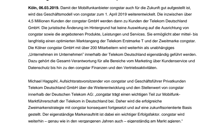 Köln, 6. März 2019. Damit der Mobilfunkanbieter congstar auch für die Zukunft gut aufgestellt ist, wird das Geschäftsmodell von congstar zum 1. April 2019 weiterentwickelt. Die inzwischen über 4,5 Millionen Kunden der congstar GmbH werden dann zu Kunden der Telekom Deutschland GmbH. Die juristische Änderung im Hintergrund hat keine Auswirkung auf die Ausrichtung von congstar sowie die angebotenen Produkte, Leistungen und Services. Sie ermöglicht aber mittel- bis langfristig einen optimierten Marktangang der Telekom Erstmarke T und der Zweitmarke congstar. Die Kölner congstar GmbH mit über 200 Mitarbeitern wird weiterhin als unabhängiges „Unternehmen im Unternehmen” innerhalb der Telekom Deutschland eigenständig geführt werden. Dazu gehört die Gesamt-Verantwortung für alle Bereiche vom Marketing über Kundenservice und Datenschutz bis hin zu den congstar Finanzen und den Vertriebsaktivitäten.