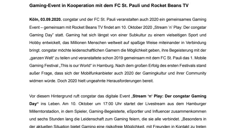 Köln, 03.09.2020. congstar und der FC St. Pauli veranstalten auch 2020 ein gemeinsames Gaming Event – gemeinsam mit Rocket Beans TV findet am 10. Oktober 2020 „Stream ’n’ Play: Der congstar Gaming Day” statt.