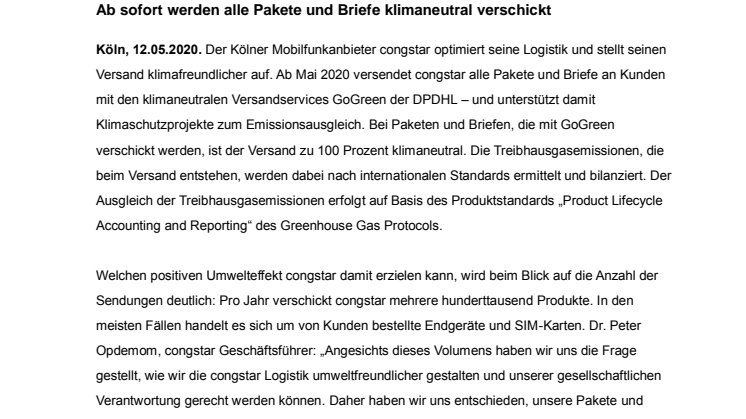 Dr. Peter Opdemom, congstar Geschäftsführer: „Angesichts dieses Volumens haben wir uns die Frage gestellt, wie wir die congstar Logistik umweltfreundlicher gestalten und unserer gesellschaftlichen Verantwortung gerecht werden können. Daher haben wir uns entschieden, unsere Pakete und Briefe in Zukunft klimaneutral zu verschicken – und unseren CO2-Fußabdruck weiter zu reduzieren.“