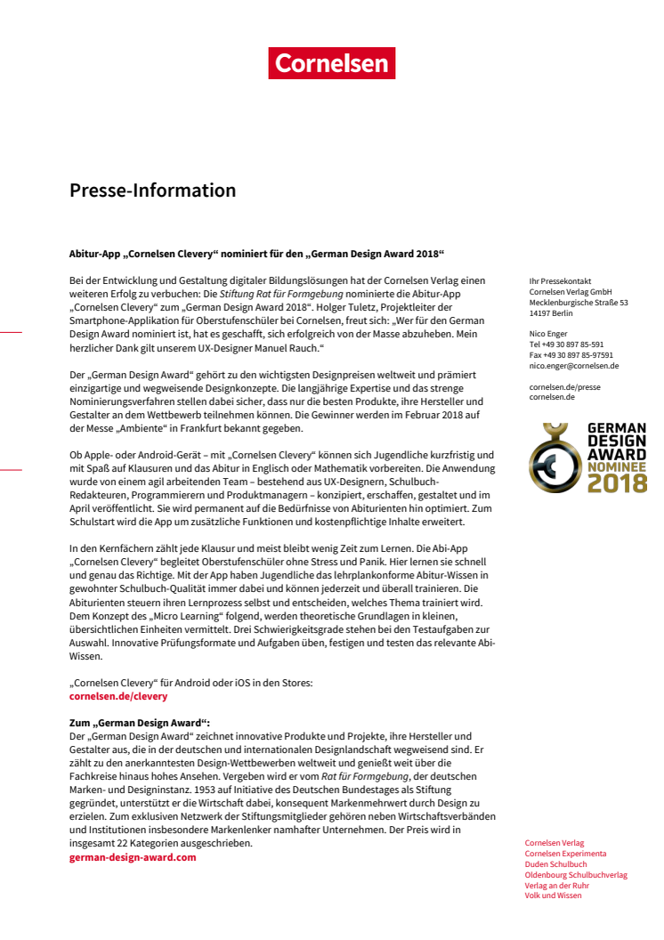Bei der Entwicklung und Gestaltung digitaler Bildungslösungen hat der Cornelsen Verlag einen weiteren Erfolg zu verbuchen: Die Stiftung Rat für Formgebung nominierte die Abitur-App „Cornelsen Clevery“ zum „German Design Award 2018“.