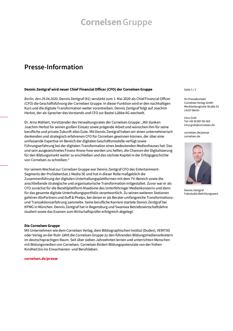 Dennis Zentgraf (41) verstärkt zum 1. Mai 2020 als Chief Financial Officer (CFO) die Geschäftsführung der Cornelsen Gruppe. In dieser Funktion wird er den nachhaltigen Kurs und die digitale Transformation weiter vorantreiben. Dennis Zentgraf folgt auf Joachim Herbst, der als Sprecher des Vorstands und CFO zur Bastei Lübbe AG wechselt.