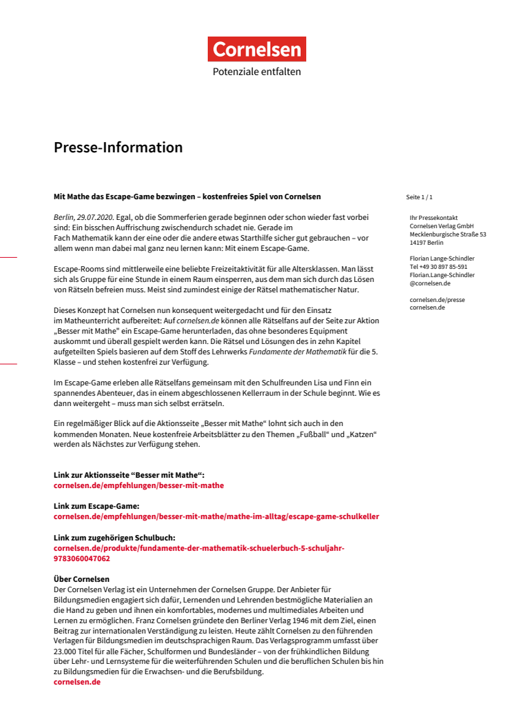 Auf cornelsen.de können alle Rätselfans auf der Seite zur Aktion „Besser mit Mathe" ein Escape-Game herunterladen, das ohne besonderes Equipment auskommt und überall gespielt werden kann. Die Rätsel und Lösungen des in zehn Kapitel aufgeteilten Spiels basieren auf dem Stoff des Lehrwerks Fundamente der Mathematik für die 5. Klasse – und stehen kostenfrei zur Verfügung.