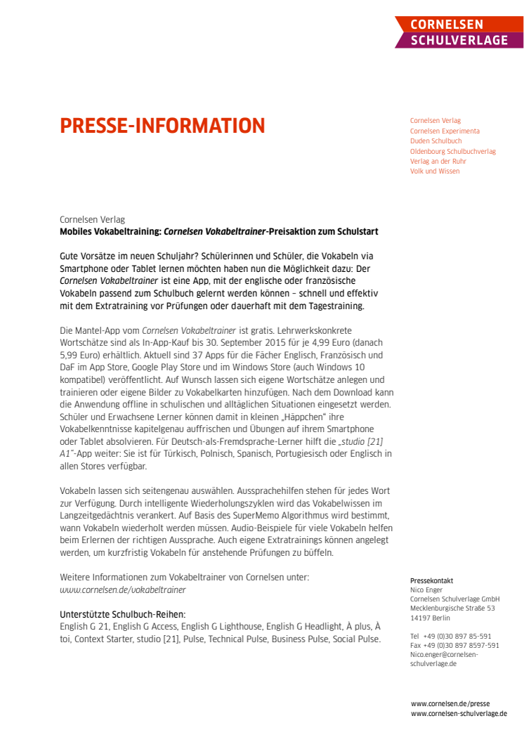 Gute Vorsätze im neuen Schuljahr? Schüler, die Vokabeln via Smartphone oder Tablet lernen möchten haben nun die Möglichkeit dazu: Der Cornelsen Vokabeltrainer ist eine App, mit der englische oder französische Vokabeln passend zum Schulbuch gelernt werden können. Die Mantel-App ist gratis. Lehrwerkskonkrete Wortschätze sind als In-App-Kauf bis 30. September 2015 für je 4,99 Euro erhältlich.