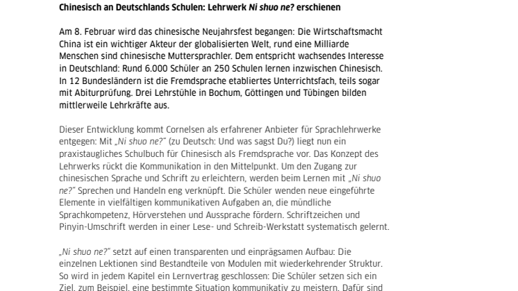 Dieser Entwicklung kommt Cornelsen als erfahrener Anbieter für Sprachlehrwerke entgegen: Mit „Ni shuo ne?“ (zu Deutsch: Und was sagst Du?) liegt nun ein praxistaugliches Schulbuch für Chinesisch als Fremdsprache vor. Das Konzept des Lehrwerks rückt die Kommunikation in den Mittelpunkt. Um den Zugang zur chinesischen Sprache und Schrift zu erleichtern, werden beim Lernen mit „Ni shuo ne?“ Sprechen und Handeln eng verknüpft. Die Schüler wenden neue eingeführte Elemente in vielfältigen kommunikativen Aufgaben an, die mündliche Sprachkompetenz, Hörverstehen und Aussprache fördern. Schriftzeichen und Pinyin-Umschrift werden in einer Lese- und Schreib-Werkstatt systematisch gelernt.