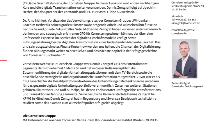 Dr. Arno Mahlert, Vorsitzender des Verwaltungsrates der Cornelsen Gruppe: „Wir danken Joachim Herbst für seinen großen Einsatz sowie prägende Arbeit und wünschen ihm für seine berufliche und private Zukunft alles Gute. Mit Dennis Zentgraf haben wir einen unternehmerisch denkenden und strategisch erfahrenen CFO für Cornelsen gewinnen können, der über eine umfassende Expertise im Bereich der digitalen Geschäftsmodelle verfügt sowie Führungserfahrung bei der digitalen Transformation eines bedeutenden Medienhauses hat. Das und sein ausgezeichnetes Finanz-Know-how werden uns helfen, die Chancen der Digitalisierung für den Bildungsmarkt weiter zu erschließen und das nächste Kapitel in der Erfolgsgeschichte von Cornelsen zu schreiben.“