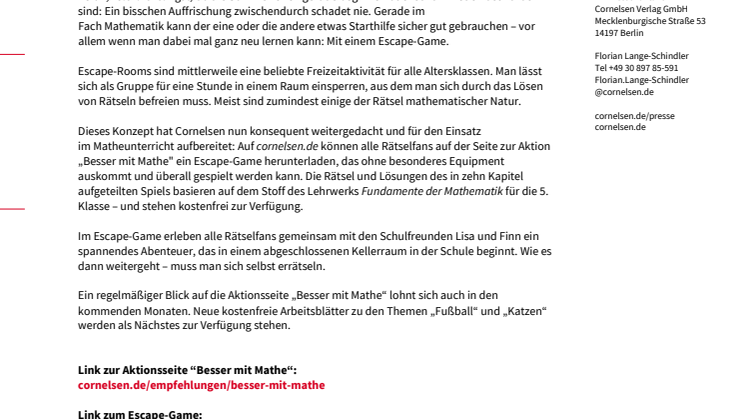 Dieses Konzept hat Cornelsen nun konsequent weitergedacht und für den Einsatz im Matheunterricht aufbereitet: Auf cornelsen.de können alle Rätselfans auf der Seite zur Aktion „Besser mit Mathe" ein Escape-Game herunterladen, das ohne besonderes Equipment auskommt und überall gespielt werden kann. Die Rätsel und Lösungen des in zehn Kapitel aufgeteilten Spiels basieren auf dem Stoff des Lehrwerks Fundamente der Mathematik für die 5. Klasse – und stehen kostenfrei zur Verfügung.