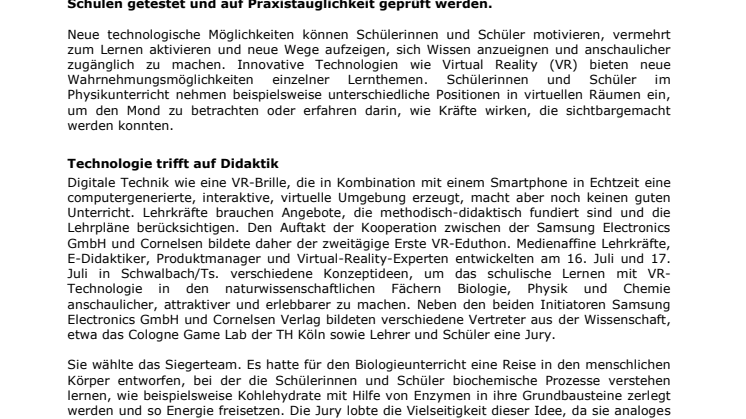 Die Samsung Electronics GmbH und der Cornelsen Verlag gehen gemeinsam neue Wege, um Lerninhalte für den Einsatz Virtueller Realität (VR) im Unterricht zu entwickeln. Auf dem Ersten VR-Eduthon wurden verschiedene Konzeptideen entwickelt, um das schulische Lernen in den naturwissenschaftlichen Fächern Biologie, Physik und Chemie anschaulicher, attraktiver und erlebbarer zu machen. Ein für den Biologieunterricht entwickeltes Konzept soll nun an ausgewählten Schulen getestet und auf Praxistauglichkeit geprüft werden.