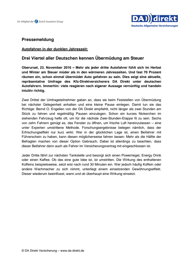 Mehr als jeder dritte Autofahrer fühlt sich im Herbst und Winter am Steuer müder als in den wärmeren Jahreszeiten. Und fast 70 Prozent räumen ein, schon einmal übermüdet Auto gefahren zu sein. Dies zeigt eine aktuelle, repräsentative Umfrage des Kfz-Direktversicherers DA Direkt unter deutschen Autofahrern.