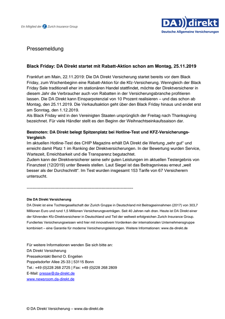 Die DA Direkt Versicherung startet bereits vor dem Black Friday, zum Wochenbeginn eine Rabatt-Aktion für die Kfz-Versicherung. Wenngleich der Black Friday Sale traditionell eher im stationären Handel stattfindet, möchte der Direktversicherer in diesem Jahr die Verbraucher auch von Rabatten in der Versicherungsbranche profitieren lassen.