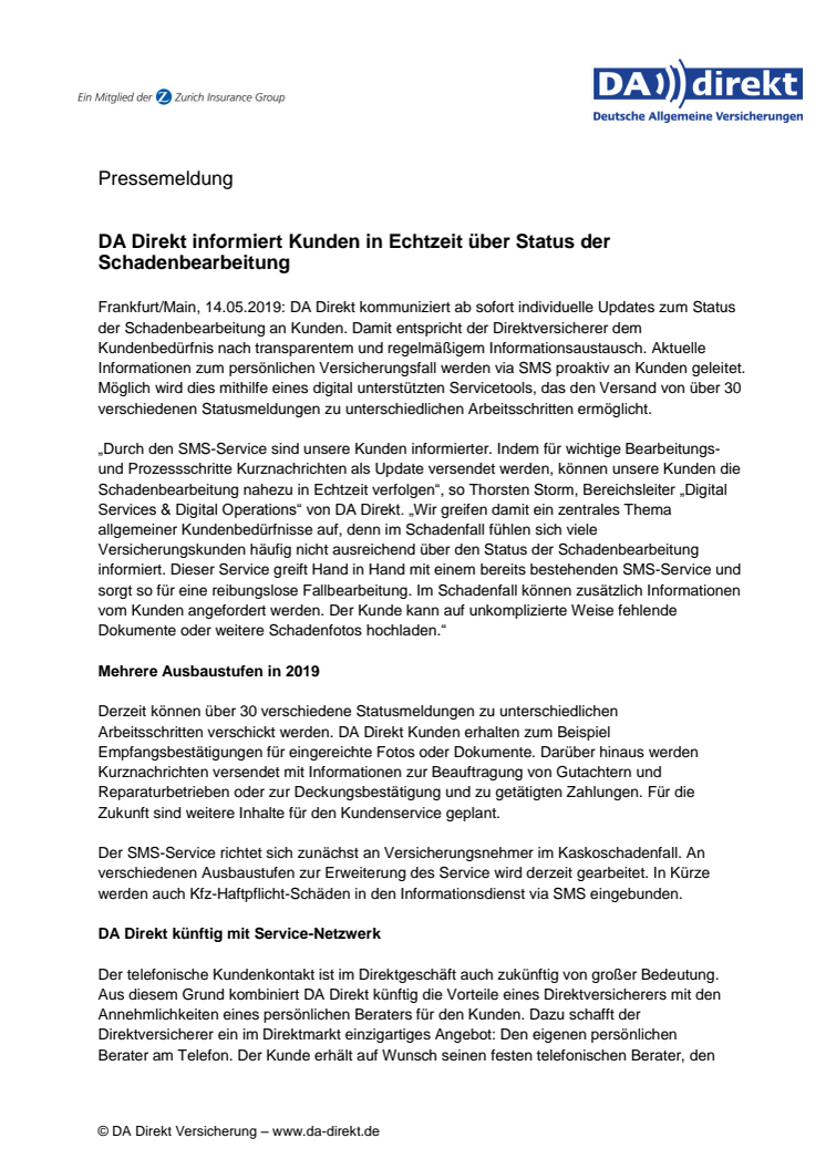 DA Direkt kommuniziert ab sofort individuelle Updates zum Status der Schadenbearbeitung an Kunden. Damit entspricht der Direktversicherer dem Kundenbedürfnis nach transparentem und regelmäßigem Informationsaustausch. Aktuelle Informationen zum persönlichen Versicherungsfall werden via SMS proaktiv an Kunden geleitet.