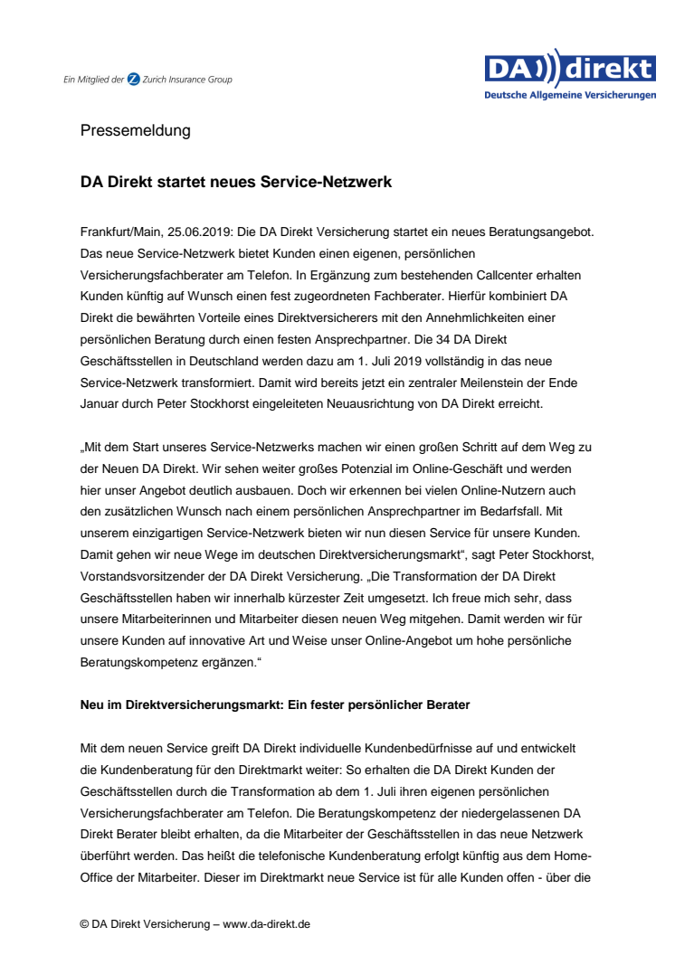 Die DA Direkt Versicherung startet ein neues Beratungsangebot. Das neue Service-Netzwerk bietet Kunden einen eigenen, persönlichen Versicherungsfachberater am Telefon. In Ergänzung zum bestehenden Callcenter erhalten Kunden künftig auf Wunsch einen fest zugeordneten Fachberater. Hierfür kombiniert DA Direkt Vorteile eines Direktversicherers mit den Annehmlichkeiten einer persönlichen Beratung.