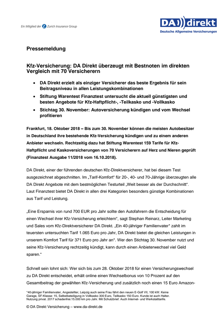 DA Direkt, einer der führenden deutschen Kfz-Direktversicherer, hat im Stiftung Warentest Finanztest (11/2018) ausgezeichnet abgeschnitten. Im „Tarif-Komfort“ für 20-, 40- und 70-Jährige überzeugten alle DA Direkt Angebote mit dem bestmöglichen Testurteil „Weit besser als der Durchschnitt“.