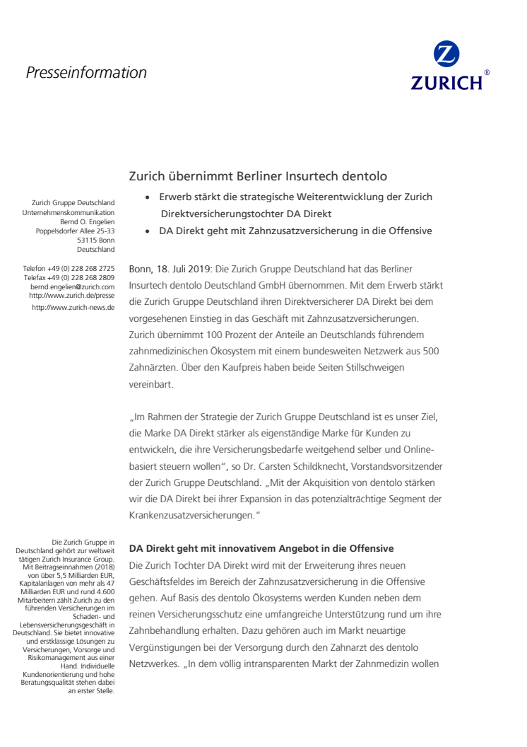 Zurich Gruppe Deutschland hat das Berliner Insurtech dentolo Deutschland GmbH übernommen. Mit dem Erwerb stärkt die Zurich Gruppe Deutschland ihren Direktversicherer DA Direkt bei dem vorgesehenen Einstieg in das Geschäft mit Zahnzusatzversicherungen. Zurich übernimmt 100 Prozent der Anteile an Deutschlands führendem zahnmedizinischen Ökosystem mit einem bundesweiten Netzwerk aus 500 Zahnärzten.