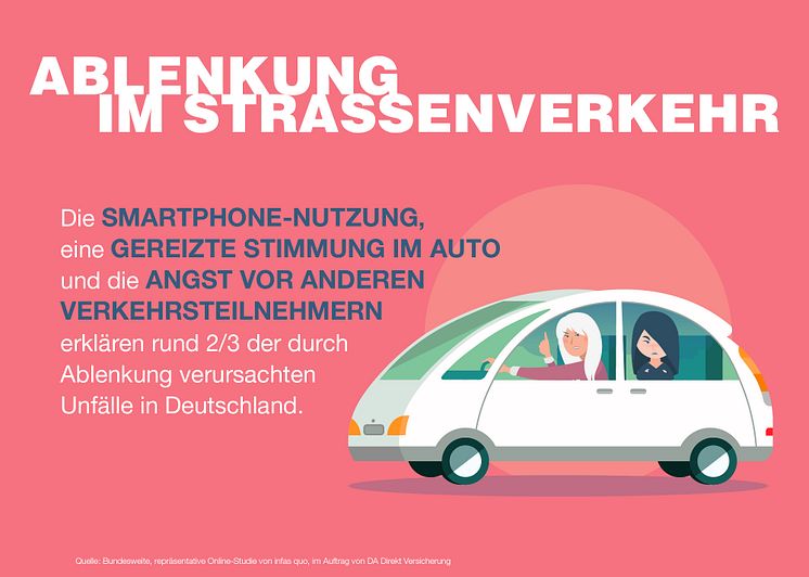 Laut aktueller DA Direkt Statistik haben drei Ablenkungs-Faktoren einen signifikant hohen Einfluss darauf in einen Unfall oder in eine gefährliche Situation zu geraten: Dazu zählen die Nutzungshäufigkeit des Smartphones, eine gereizte Stimmung im Auto und die eigene Angst des Fahrers davor, dass andere Verkehrsteilnehmer eine Gefahr darstellen. In Summe können so rund zwei Drittel (60%), der durch Ablenkung verursachten Unfälle erklärt werden.