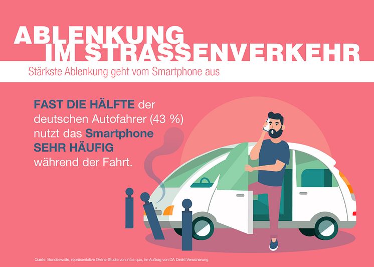 Aus der Untersuchung der DA Direkt Versicherung und infas quo geht weiter hervor, dass die stärkste Ablenkung insgesamt vom Smartphone ausgeht - fast die Hälfte der Befragten nutzt es sehr häufig während der Fahrt (43%). Egel ob Telefonate geführt oder sogar Bilder und Nachrichten auf Social Media gepostet werden, die Bedienung des Smartphones während der Fahrt lenkt stark vom Straßenverkehr ab.