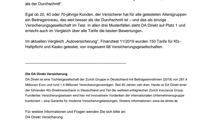 DA Direkt ist eine Tochtergesellschaft der Zurich Gruppe in Deutschland mit Beitragseinnahmen (2018) von 287,4 Millionen Euro und rund 1,4 Millionen Versicherungsverträgen. Seit 40 Jahren nah dran. Heute ist DA Direkt einer der führenden Kfz-Direktversicherer in Deutschland und Teil der weltweit erfolgreichen Zurich Insurance Group. Fundiertes Versicherungswissen wird hier mit innovativem Vordenken der internationalen Unternehmensgruppe kombiniert – eine Garantie für moderne Versicherungsleistungen.