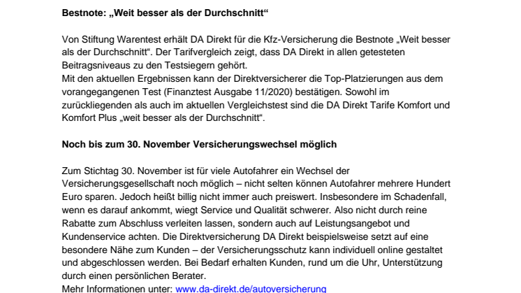 Zum Stichtag 30. November ist für viele Autofahrer ein Wechsel der Versicherungsgesellschaft noch möglich – nicht selten können Autofahrer mehrere Hundert Euro sparen. Jedoch heißt billig nicht immer auch preiswert. Insbesondere im Schadenfall, wenn es darauf ankommt, wiegt Service und Qualität schwerer. Also nicht durch reine Rabatte zum Abschluss verleiten lassen, sondern auch auf Leistungsangebot und Kundenservice achten. Die Direktversicherung DA Direkt beispielsweise setzt auf eine besondere Nähe zum Kunden – der Versicherungsschutz kann individuell online gestaltet und abgeschlossen werden. Bei Bedarf erhalten Kunden, rund um die Uhr, Unterstützung durch einen persönlichen Berater.