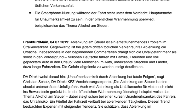 Frankfurt/Main, 04.07.2019: Ablenkung am Steuer ist ein ernstzunehmendes Problem im Straßenverkehr. Gegenwärtig ist bei jedem dritten tödlichen Verkehrsunfall Ablenkung die Ursache. Insbesondere in den beginnenden Sommerferien drängt sich die Unfallgefahr mehr als sonst in den Vordergrund – Millionen Deutsche fahren mit Familie, Freunden und voll gepacktem Auto in den Urlaub: viele Menschen im Auto, unbekannte Strecken und Länder, dazu lange Fahrtzeiten. Die Gefahr abgelenkt zu werden, steigt deutlich an.