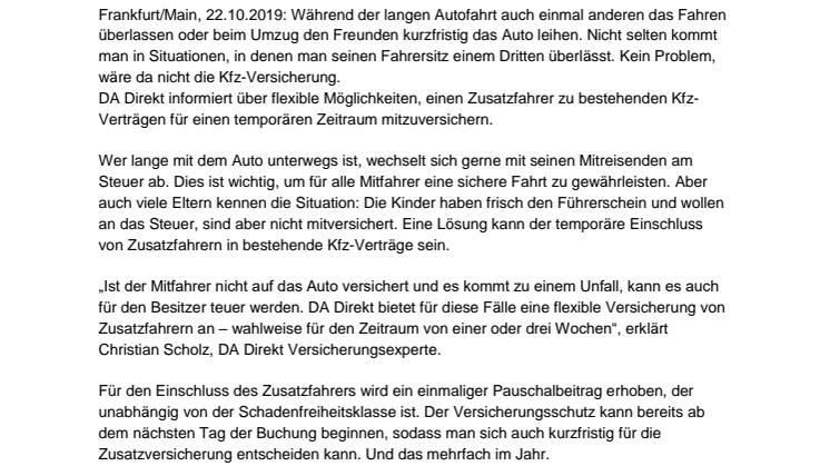 Frankfurt/Main, 22.10.2019: Während der langen Autofahrt auch einmal anderen das Fahren überlassen oder beim Umzug den Freunden kurzfristig das Auto leihen. Nicht selten kommt man in Situationen, in denen man seinen Fahrersitz einem Dritten überlässt. Kein Problem, wäre da nicht die Kfz-Versicherung. DA Direkt informiert über flexible Möglichkeiten, einen Zusatzfahrer zu bestehenden Kfz-Verträgen für einen temporären Zeitraum mitzuversichern.